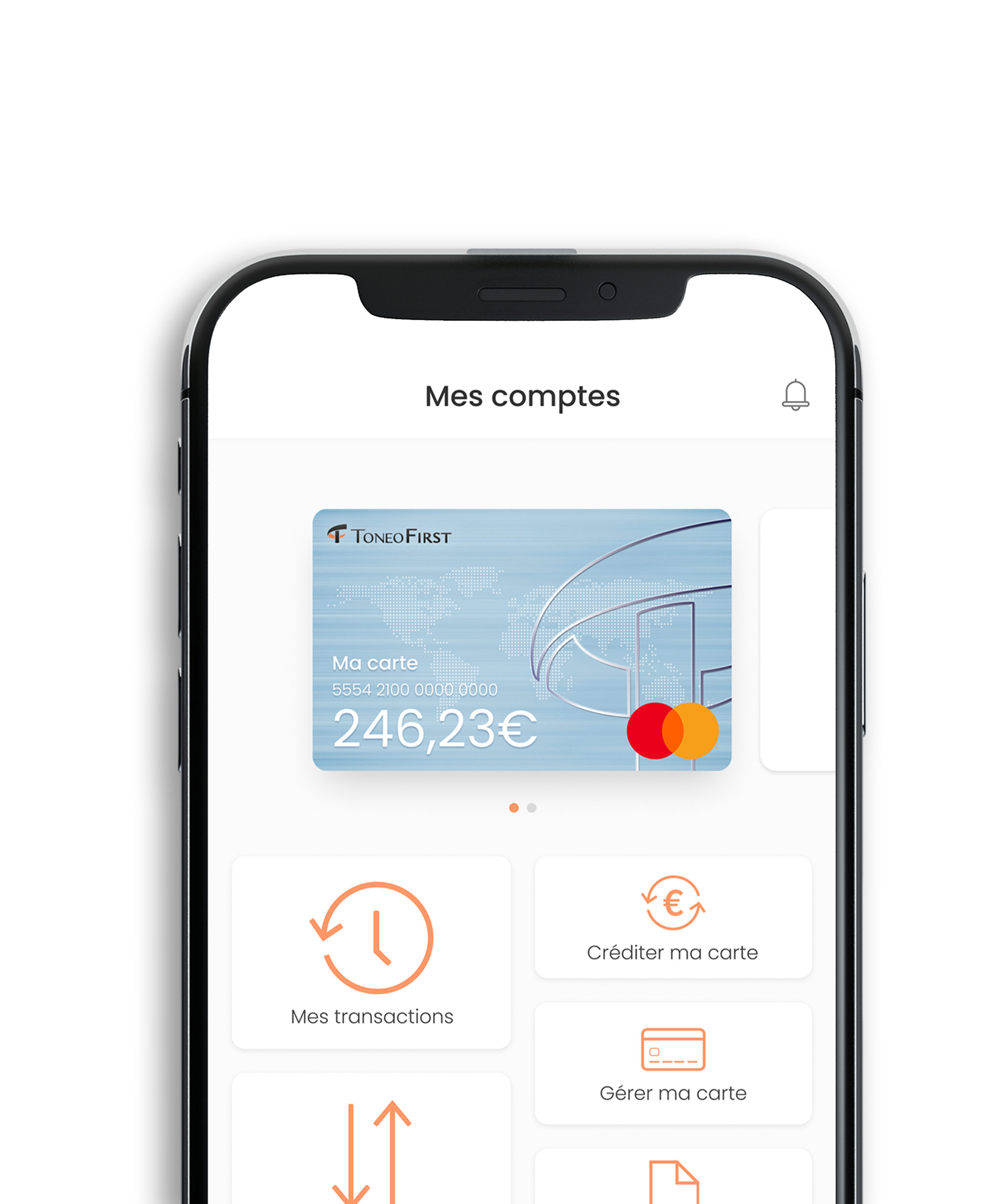 En 5 minutes top chrono, ouvrez votre compte ToneoFirst et accéder aux services de la carte Mastercard® by ToneoFirst ! La carte est accessible sans condition de revenus, sans engagement et fonctionne comme une carte de paiement classique. Les inconvénients liés à un compte bancaire en moins. Gérez en toute simplicité votre argent depuis l’application gratuite.